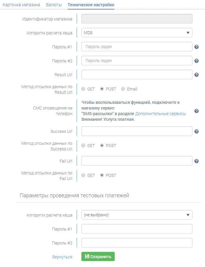 Из основных настроек, которые необходимо указать в модуле оплаты в CMS, — это «Идентификатор магазина», «Пароль 1» (используется интерфейсом инициализации оплаты) и «Пароль 2» (используется интерфейсом оповещения о платеже, XML-интерфейсами). Также необходимо выбрать отображаемые методы оплаты. В свою очередь, в технических настройках личного кабинета Робокассы указываются: